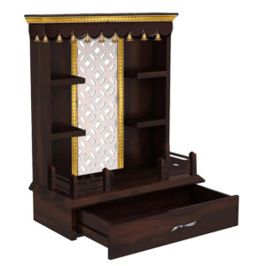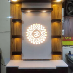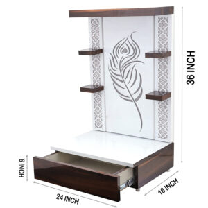 Elevate your worship experience with a modern designer mandir, perfect for a pooja room. Its intricate jali work and warm lighting create a serene ambiance, while the sleek storage and elongated design accommodate large idols As per the mandir size . A detachable platform extension tray provides extra space for thali sets and pooja essentials.